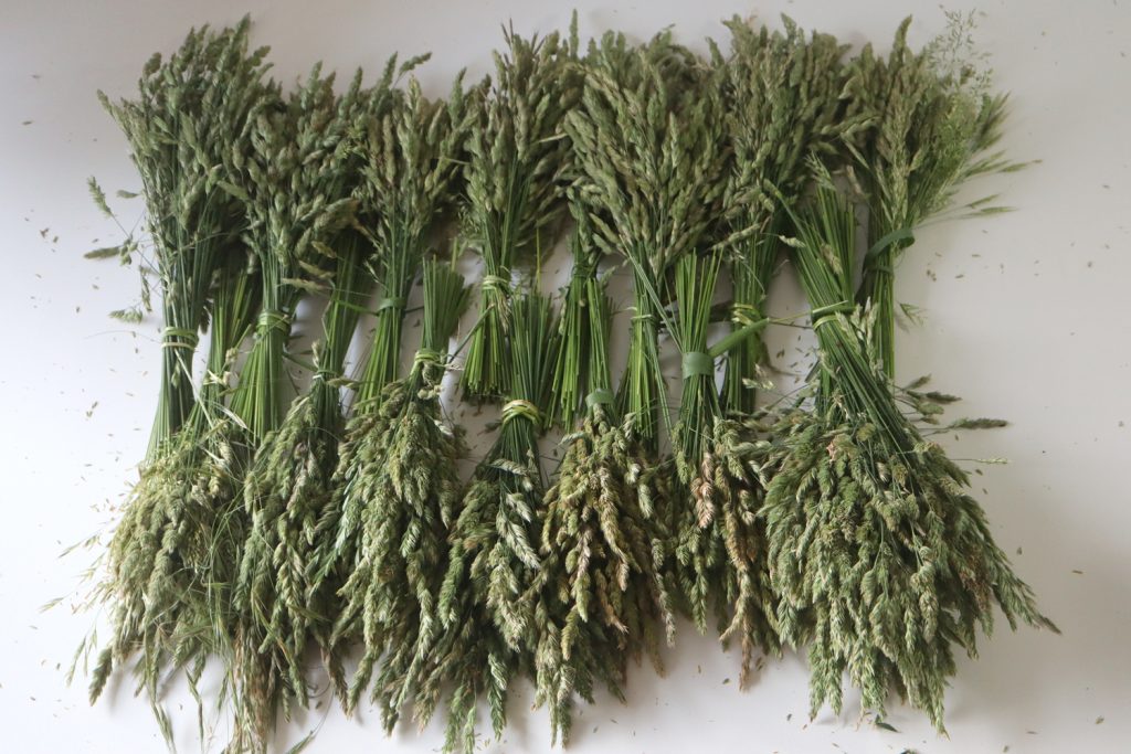 2 Sträußchen stelle ich in eine Vase, der Rest kommt in den Froster, weil ich nicht ständig solche ausufernden Aktionen starten kann. Eigentlich wäre ich jetzt reif für die Kiste, aber die Gräser müssen noch vakuumiert werden, damit sie überhaupt noch in den Froster passen.
