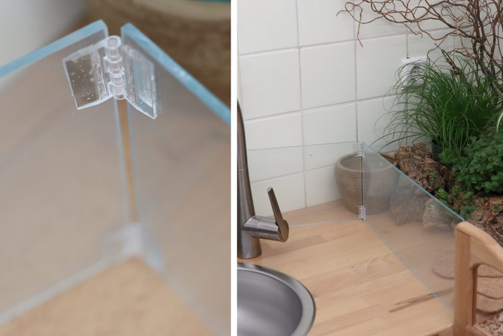 Früher hätte ich als Scharnier vermutlich ein Panzertape genommen, aber das wird halt mit der Zeit unansehnlich und klebrig. Deshalb habe ich mir dafür nun zum probieren Scharniere aus Acrylglas gekauft.