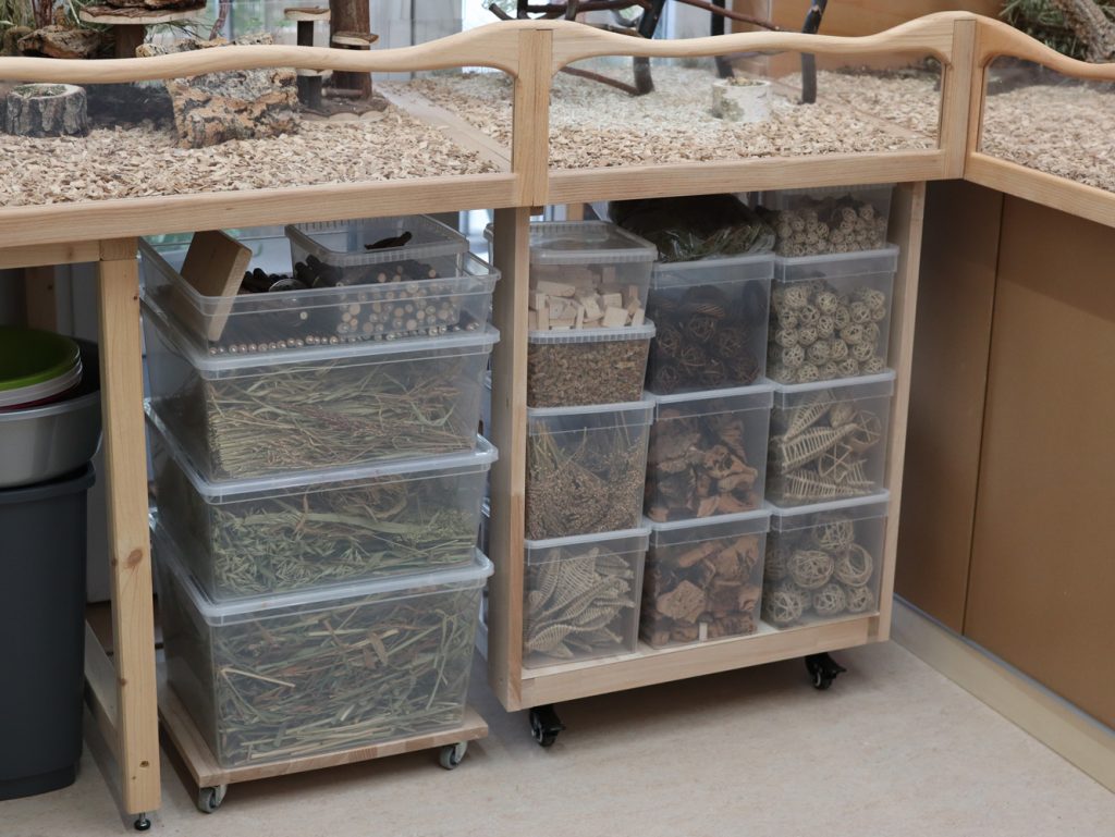 Stauraum unter dem Fensterbereich, auch erst einmal nur provisorisch, denn da sollen noch Türen dran, damit brutige Hennen hier keine Nistgelegenheit finden.