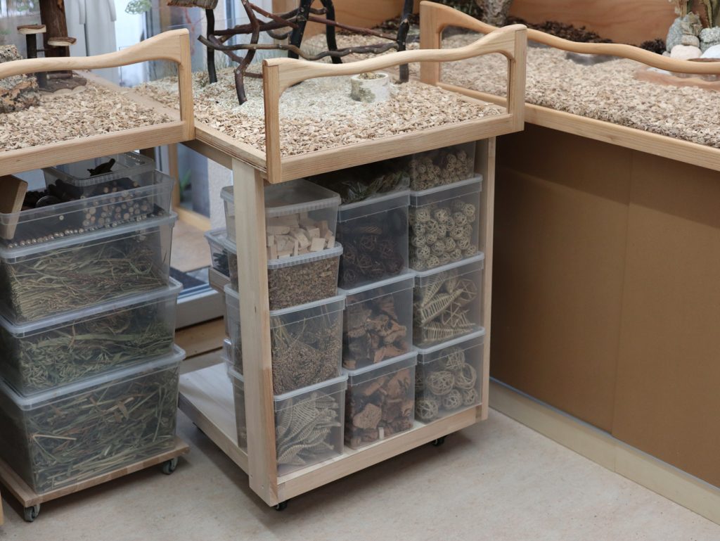 Damit ich das rechte Fenster zum Balkon öffnen kann, ist davor ein Rollwagen entstanden. Das war gar nicht so einfach umzusetzen, da hier kein einfacher rechteckiger Kasten gebaut werden konnte. Es ist von der Grundfläche ein Parallelogramm, weil sonst der lange Bereich von ca. 3,50 m bis zur Voliere nur knapp 60 cm Tiefe gehabt hätte. Hier wollte ich aber unbedingt etwas mehr Raum für die Wellies haben und so war ich gezwungen, den Bereich am Fenster mit einer Schräge in den Tischplatten zu bauen. Das Unternehmen war wirklich sehr tricky, aber ich habe es endlich geschafft:
