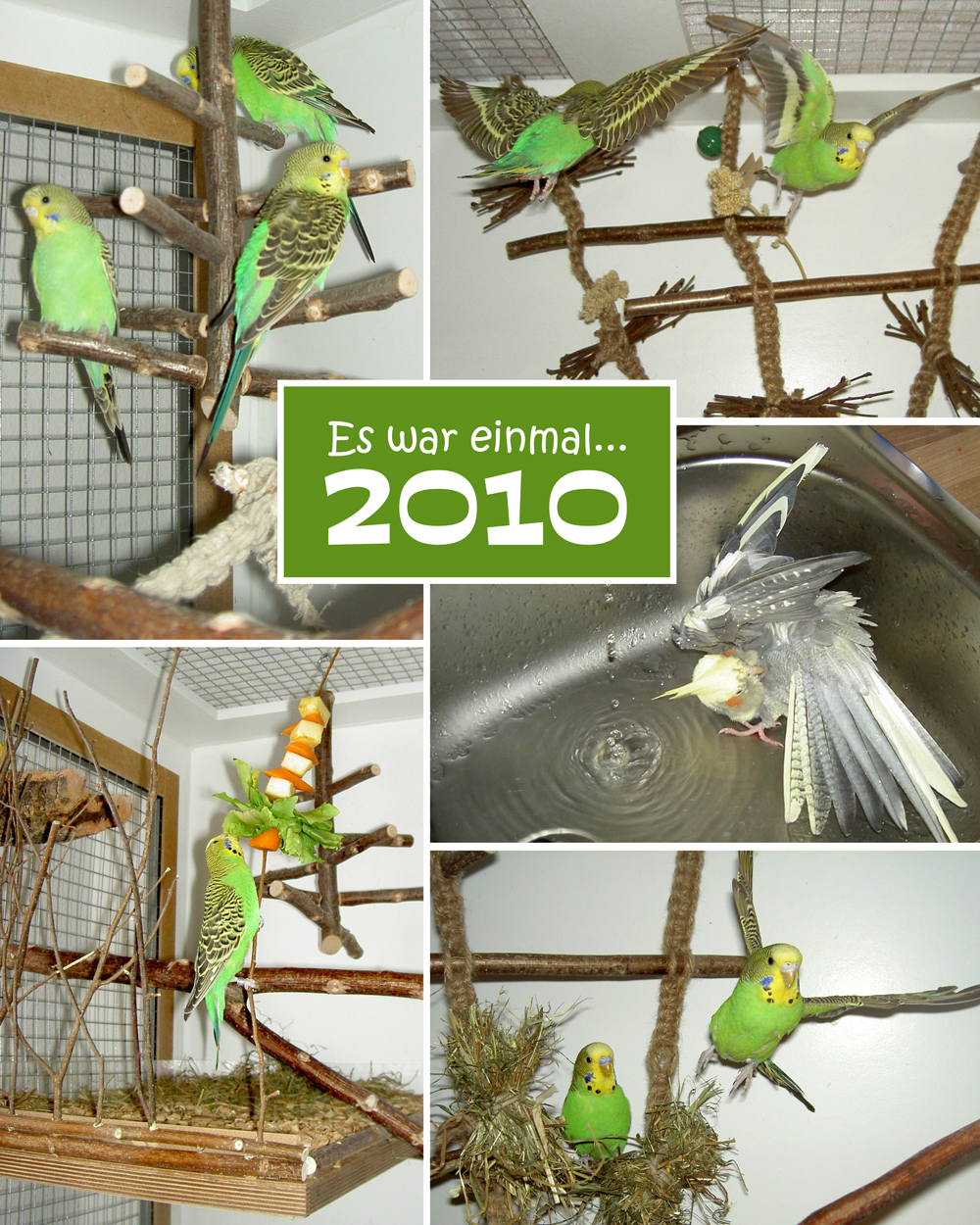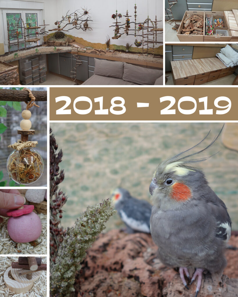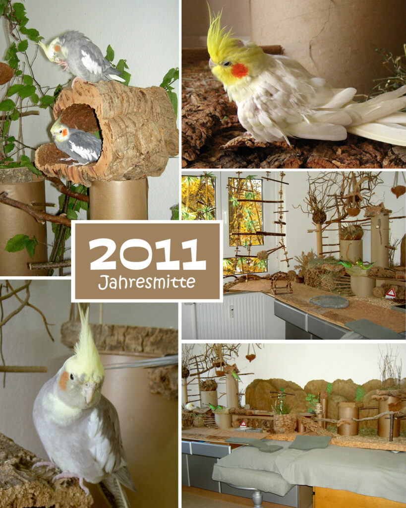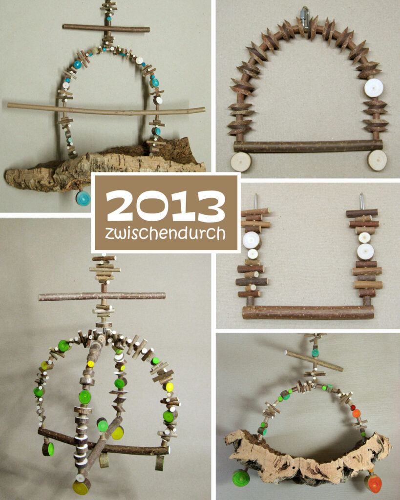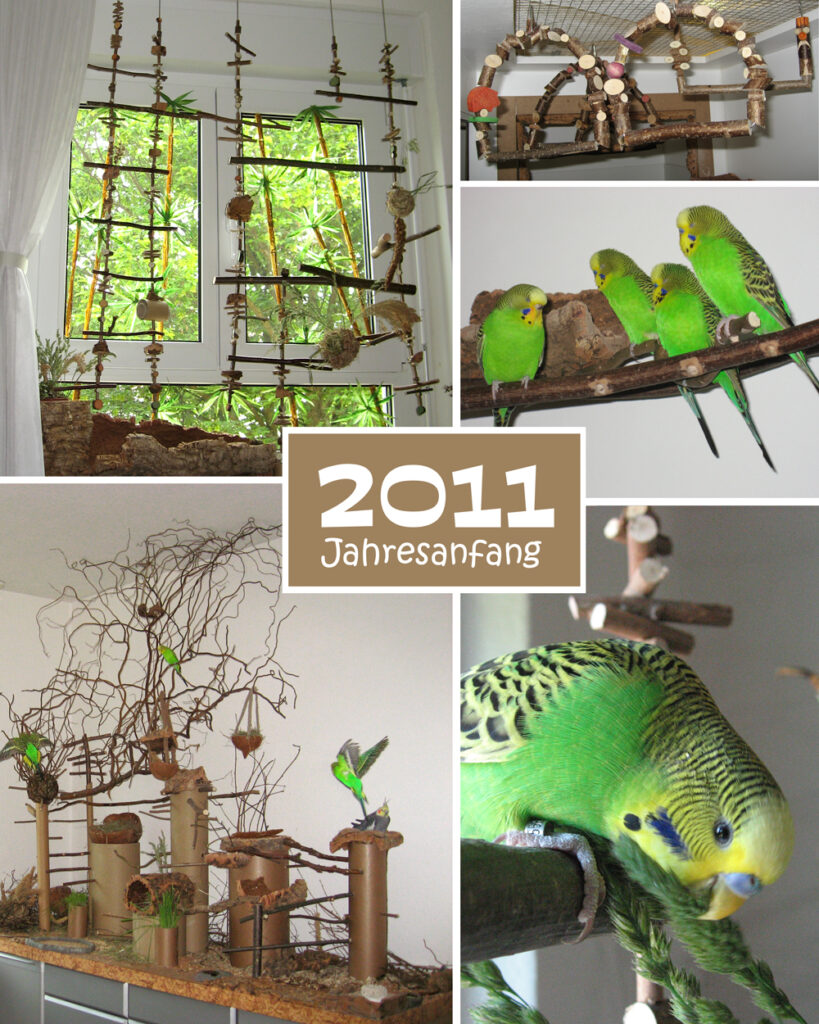 Mittlerweile war schon einiges geschehen. Es gab immer weniger Schnüre, als Ersatz die ersten Schaukeln mit Edelstahlstangen: große fürs Fenster, für die Voliere kleine Schlafschaukeln.