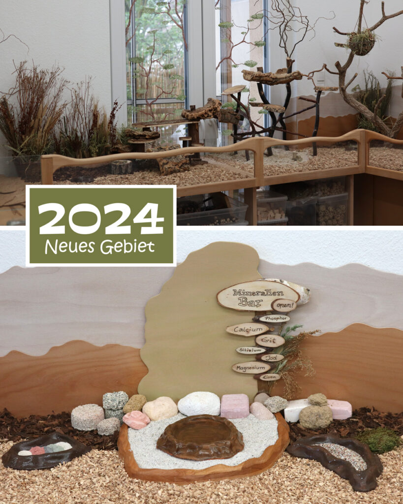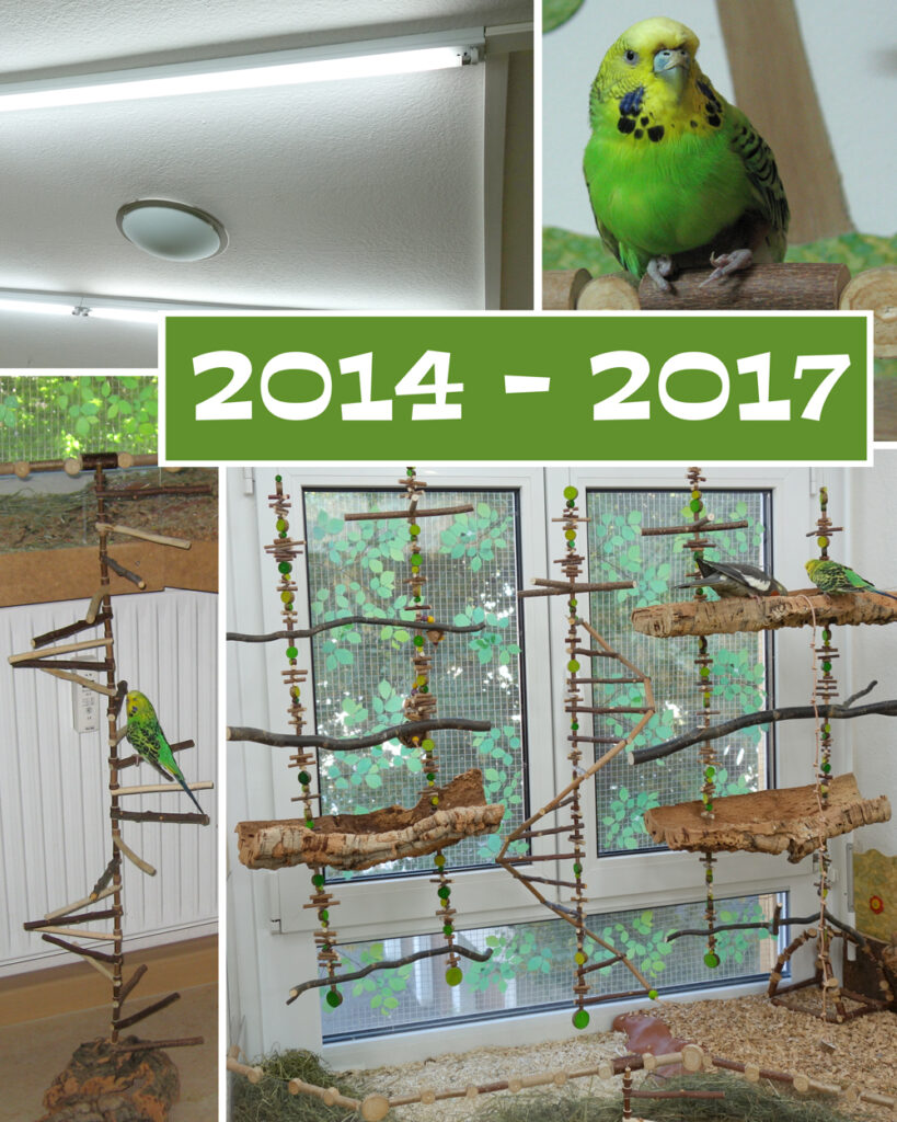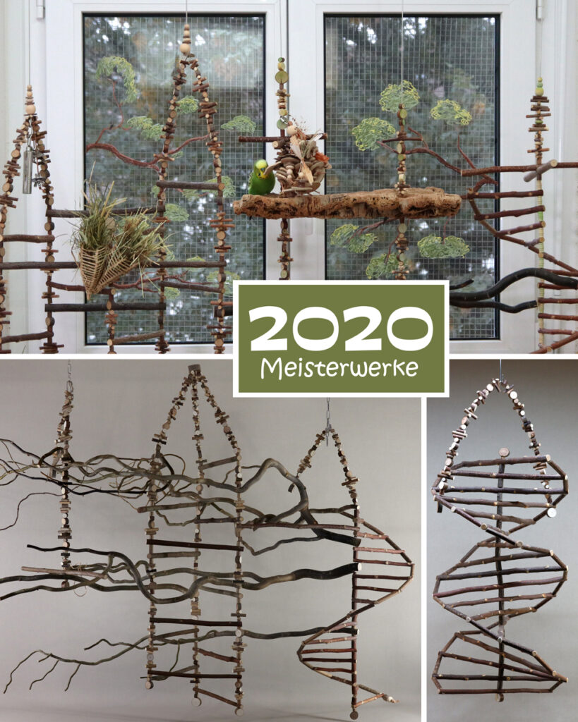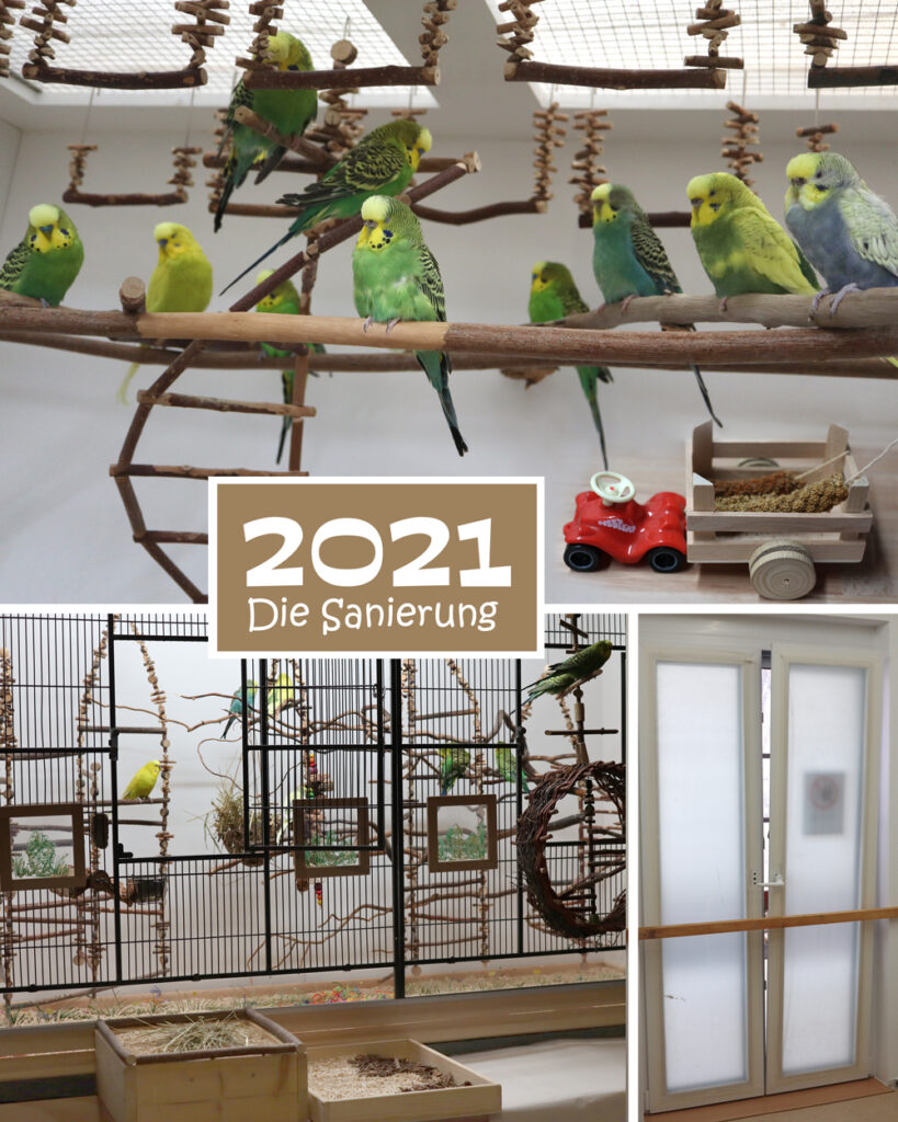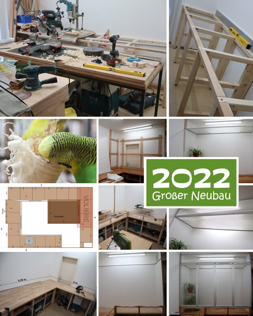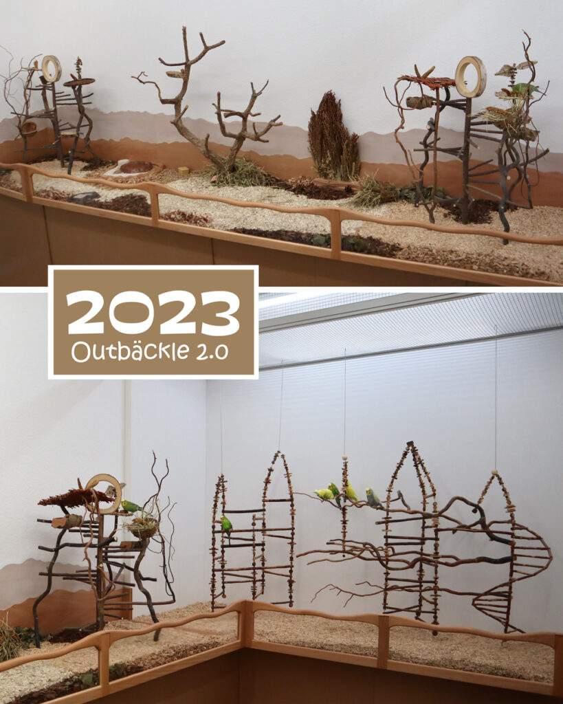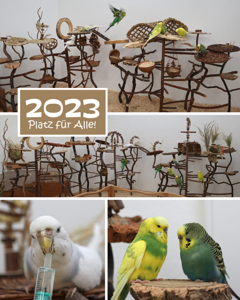 Die ersten neuen Bäume hatten den Test bestanden und so konnte ein weiterer Baum für die Voliere gebaut werden. Dieser sollte die Inklusion im Schwarm noch besser möglich machen, denn wir wurden auch Pflegestelle beim Hürdenwellies e.V.