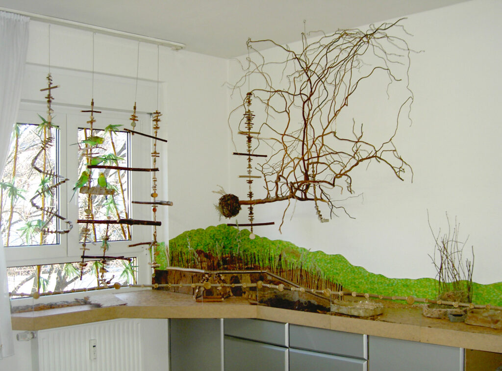 Als erstes musste natürlich was für die Wellis her, damit sie nicht übermäßig großen Stress haben (vor allem wegen Zigge und ihren Megas) und sie weiterhin ihre gewohnten Landeplätze behalten konnten. Deshalb nutzte ich fürs Erste die Korkenzieherweide, die vorher auf den Papphülsen aufgesessen hatte und machte daraus eine Schaukel, die an 2 Haken in der Zimmerdecke verankert wurden: