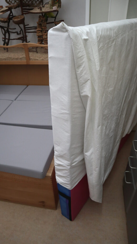 Schutzbezug für die neue Matratze. Ein normaler Bezug für eine Bettdecke reichte ganz genau in der Breite! Nebenbei ist hier auch der eng bemessene Platz zu sehen: 50 cm Durchgang zur Türe: