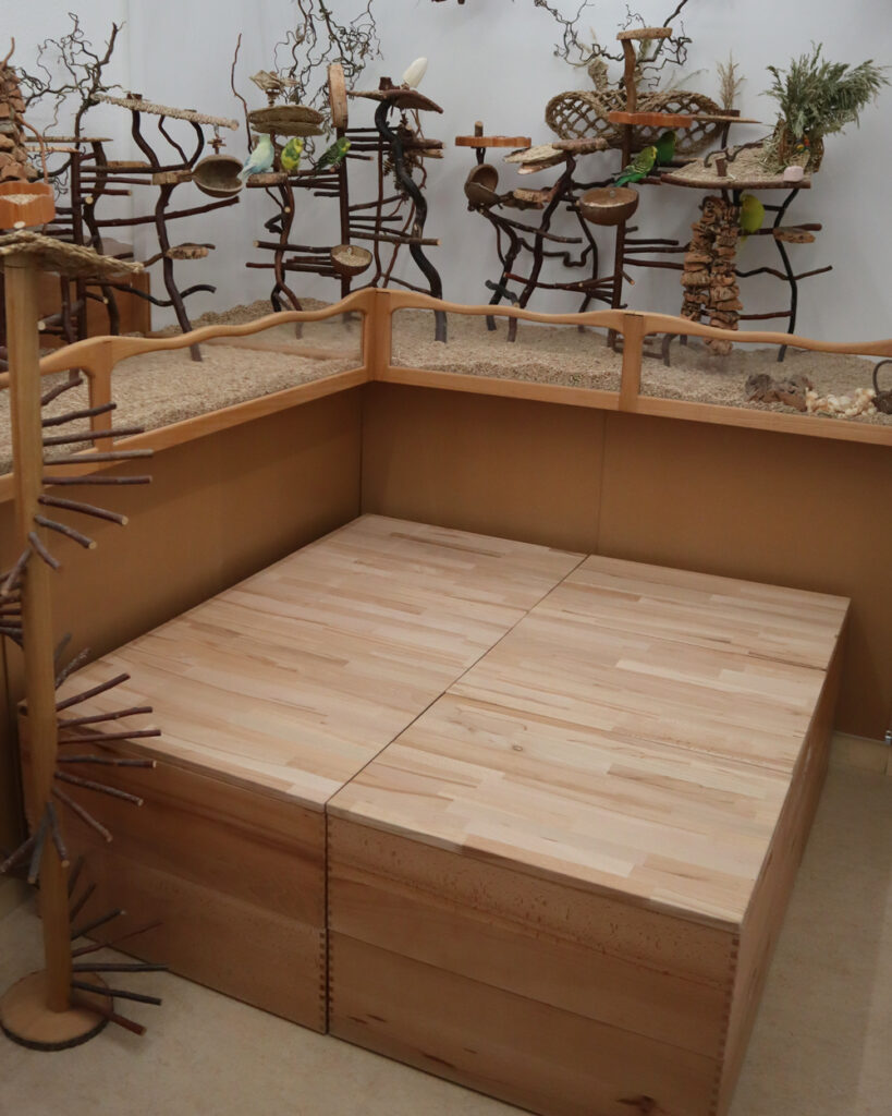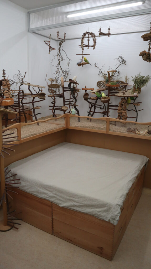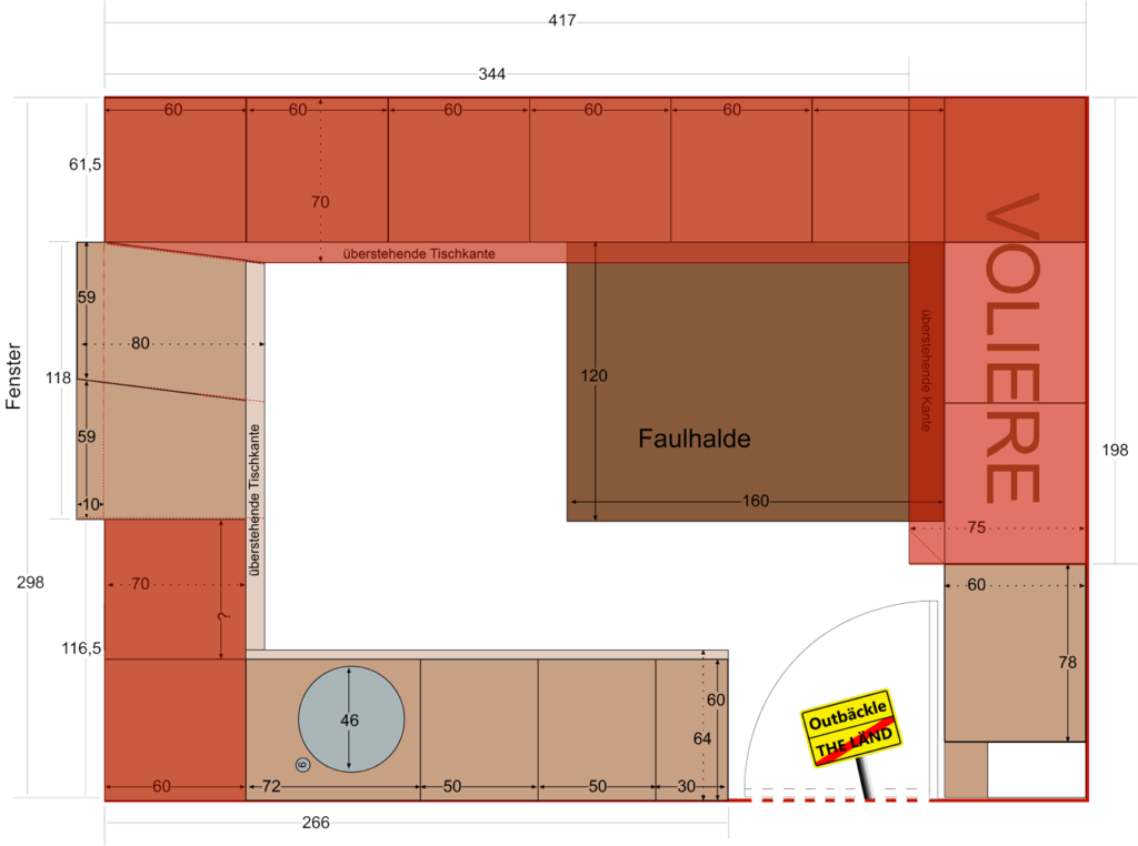 Nun geht es im Outbäckle aber doch sehr eng zu und es ist einfach kein Platz für so ein sperriges Möbelstück. Ein Sessel kam nicht in Frage, denn der Raum vor der Voliere sollte unbedingt flächig gepolstert sein, falls doch mal ein Fußgänger über das Gatter hinausspringt. Zudem bieten die 12 Holzkisten darunter noch ordentlich Stauraum für Streu & Co. Also wie alles im Outbäckle: quadratisch, praktisch, gut! ![]()