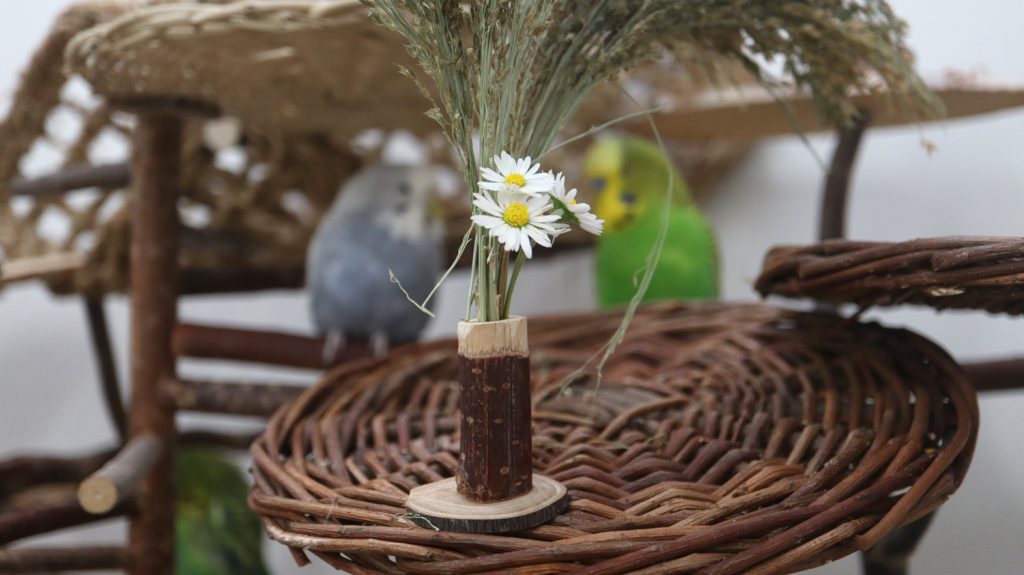 Dieses kleine Stückchen Ast ist genau genommen eine Stockchraube mit Holzkopf, denn nach unten hin hält sie das Weidenbrett an einem Ast fest. Damit die Wellies oben auch was davon haben, bohrte ich da ein Loch hinein. Hier kann alles, was steck- und fressbar ist, eingestellt werden: Wiesengräser, Hirse, Blümchen…