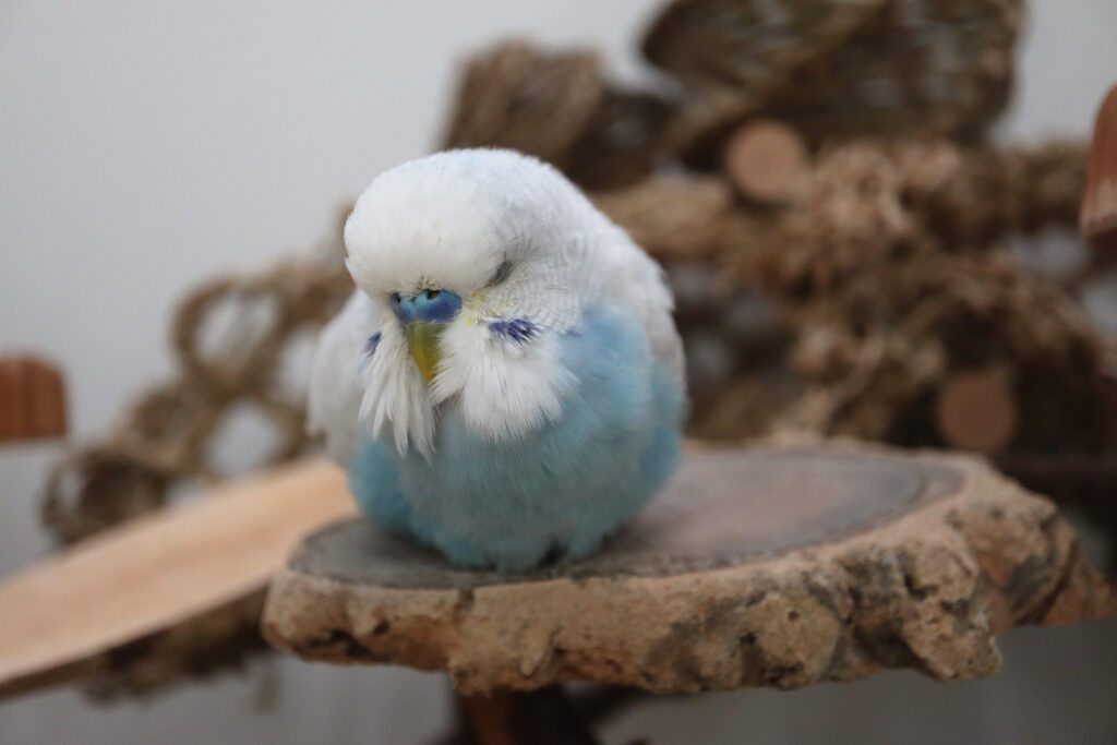 Wie frisch aus dem Ei gepellt sitzt der Ur-Ur-Opa Mimsi auf einem Brettchen und wärmt sich die arthrosegeplagten Füßchen im eigenen Flauschkleidchen.