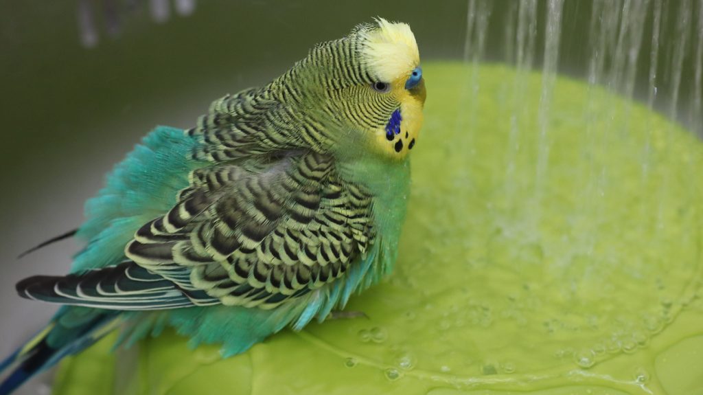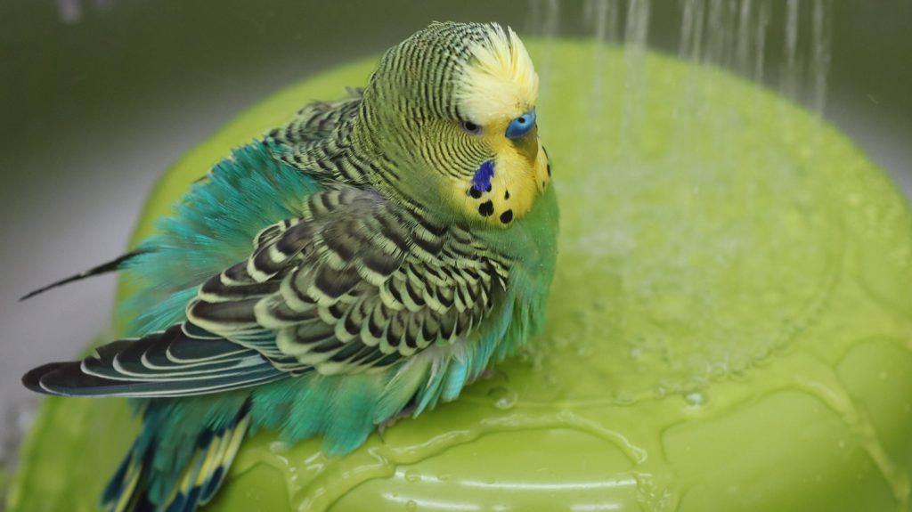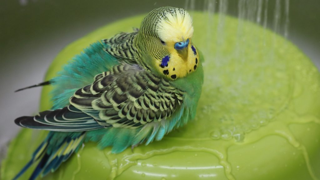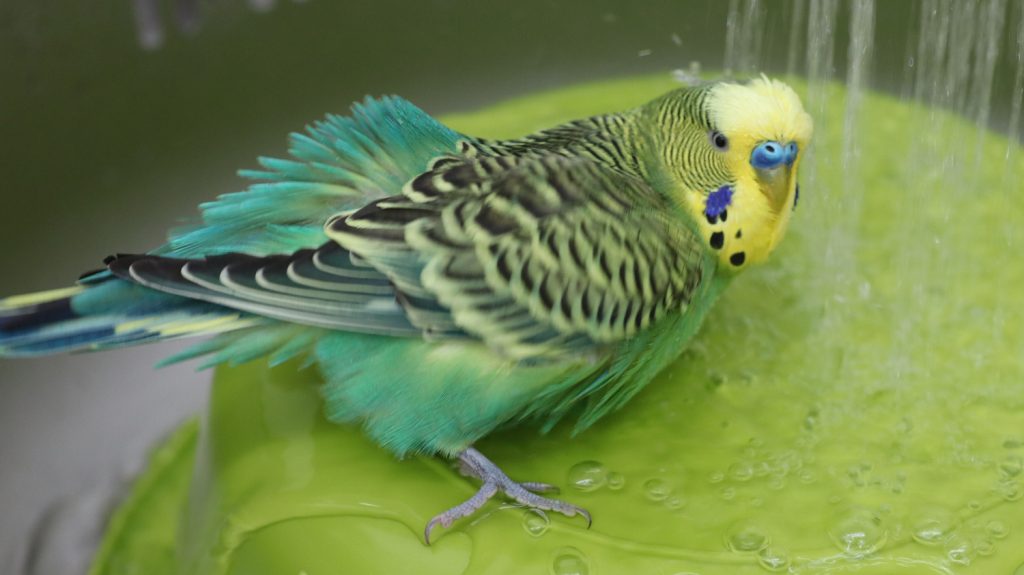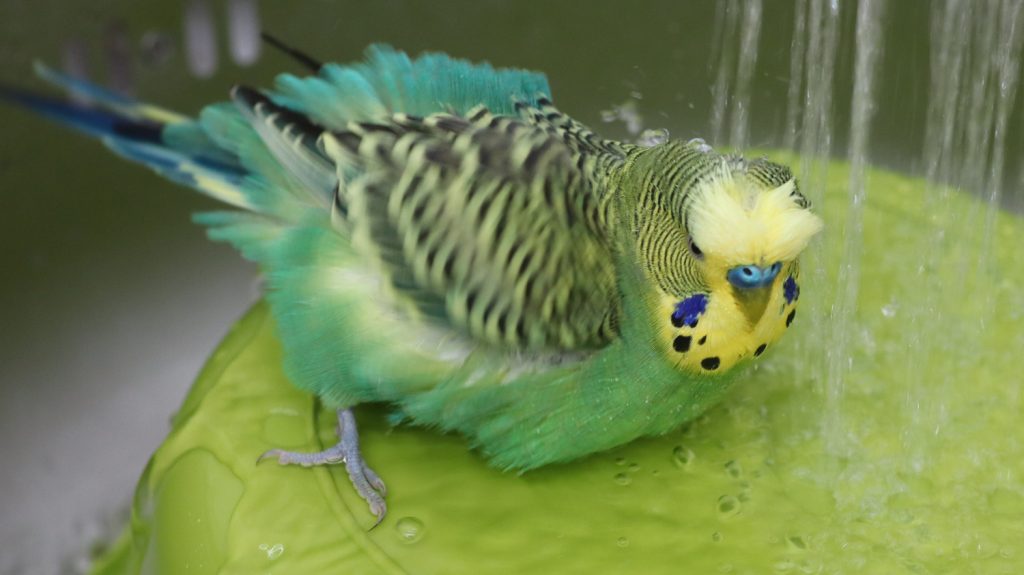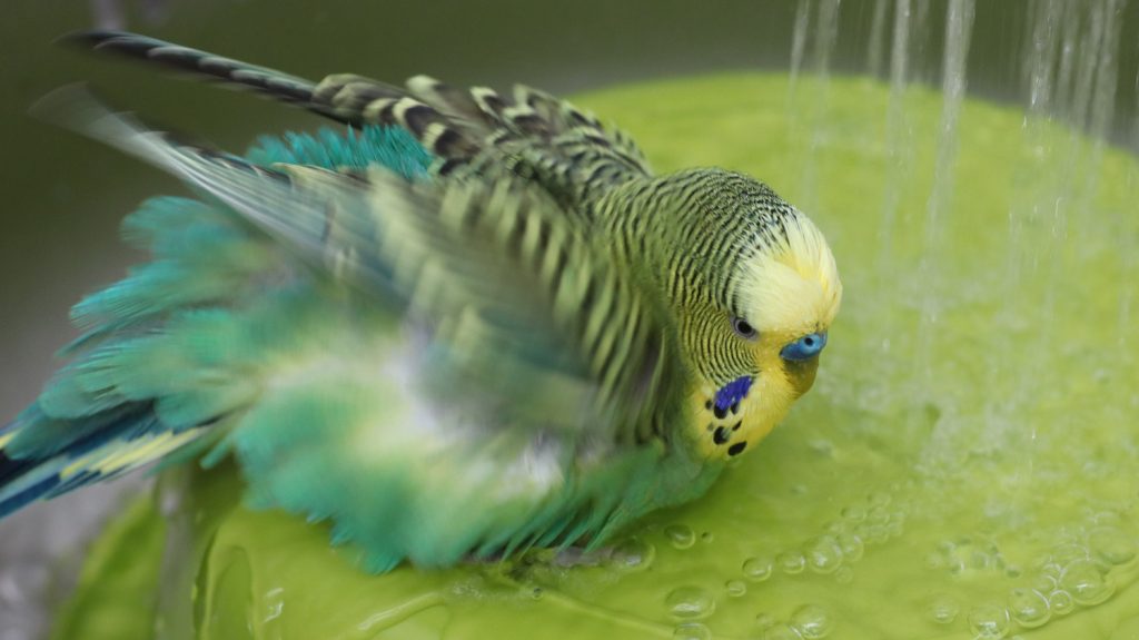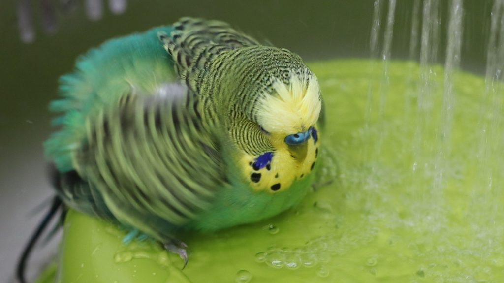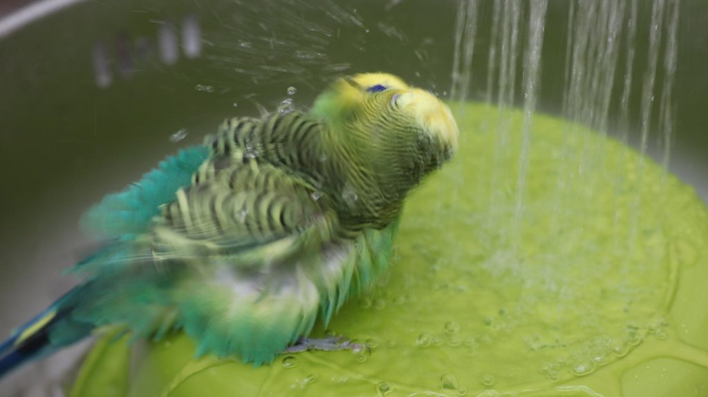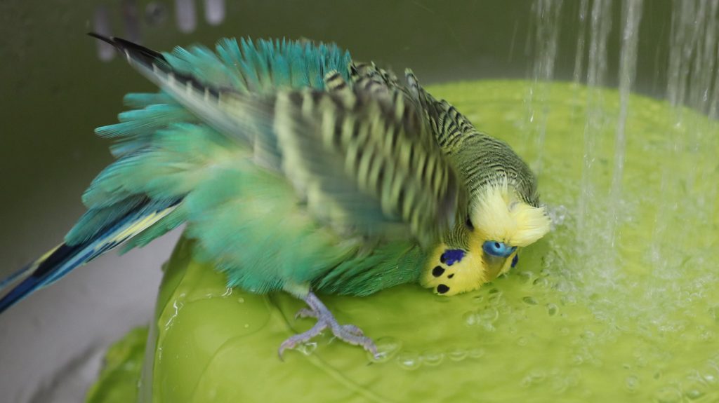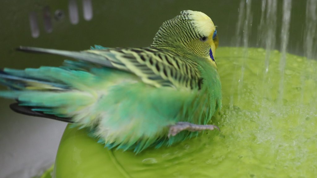 Oskar liebt die grüne Putzschale, die ich zur Reinigung des Vogelbereiches verwende. Nach Abschließen der täglichen Reinigungsarbeiten mache ich die Schüssel sauber und wenn der Oskar das mitbekommt, habe ich kaum Zeit, das Wasser auf eine angenehme Badetemperatur zu bringen. Der hibbelt dann schon total ungeduldig rum und will ganz schnell baden. JETZT!