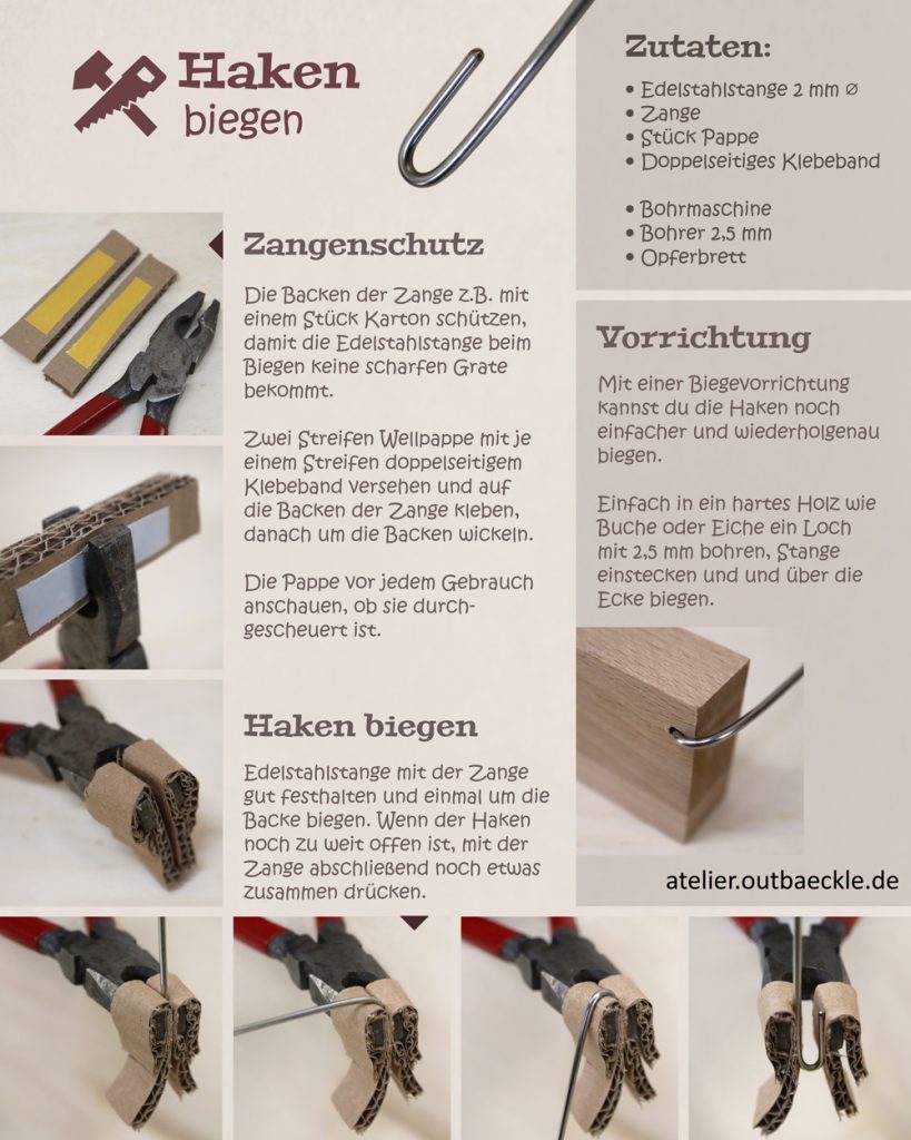 Große und kleine Haken können auf unterschiedliche Weisen gebogen werden. Die wahrscheinlich einfachste Methode geht mit einer Zange. Benötigt man öfters den gleichen Haken, empfiehlt sich eine Biegevorrichtung aus hartem Holz.