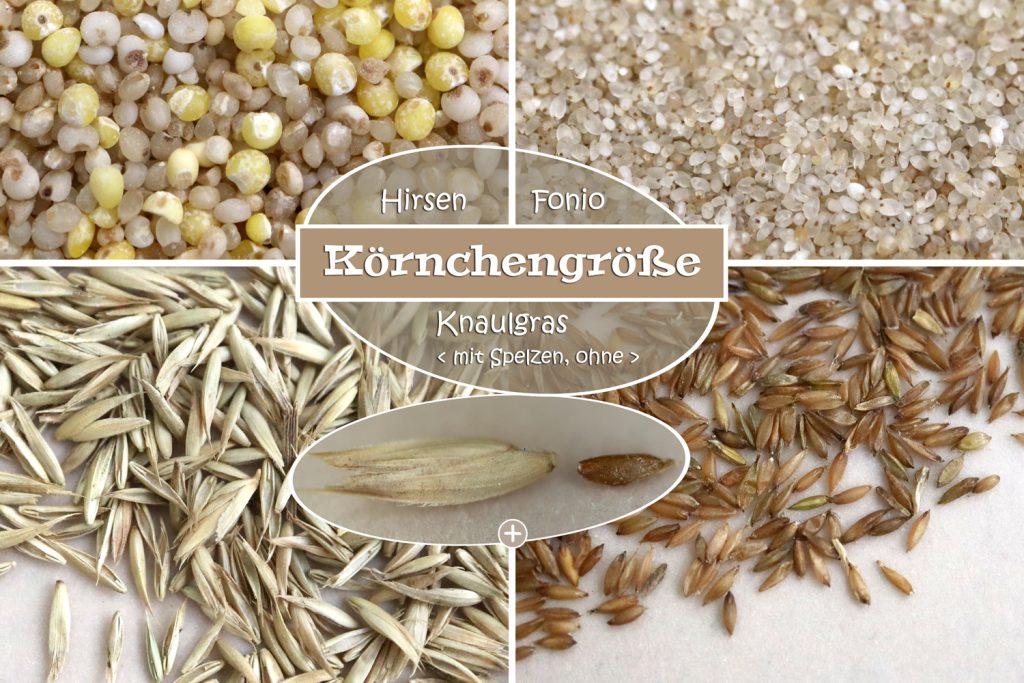 Ich habe mir die Mühe gemacht und Knaulgras entspelzt, um einen Größenvergleich zu erhalten. Für das Bild gesellte ich verschiedene entspelzte Hirsesorten, Fonio und Knaulgras dazu. Klar ist: je kleiner die Saat, desto mehr Körnchen müssen entspelzt werden, um satt zu werden. Vergleicht das Bild gerne mit dem anderen Bild aus Teil 1.