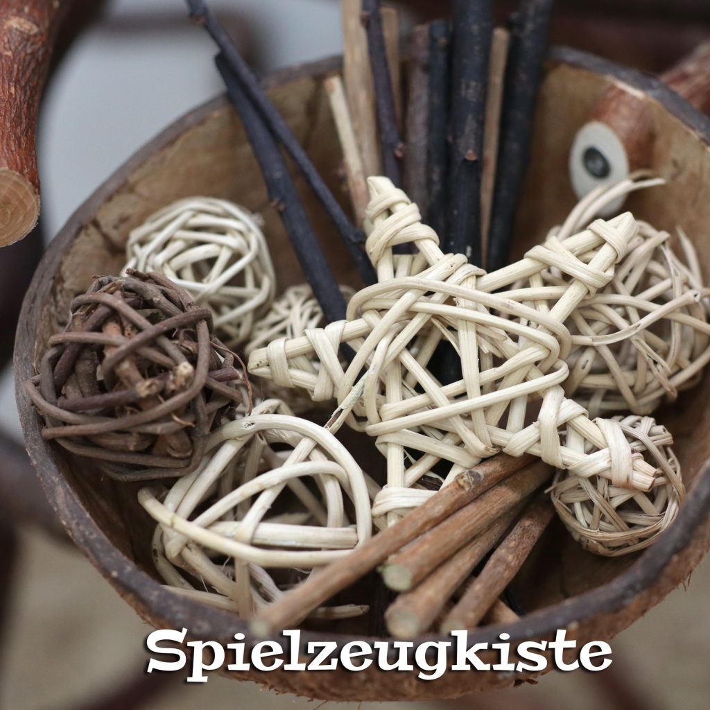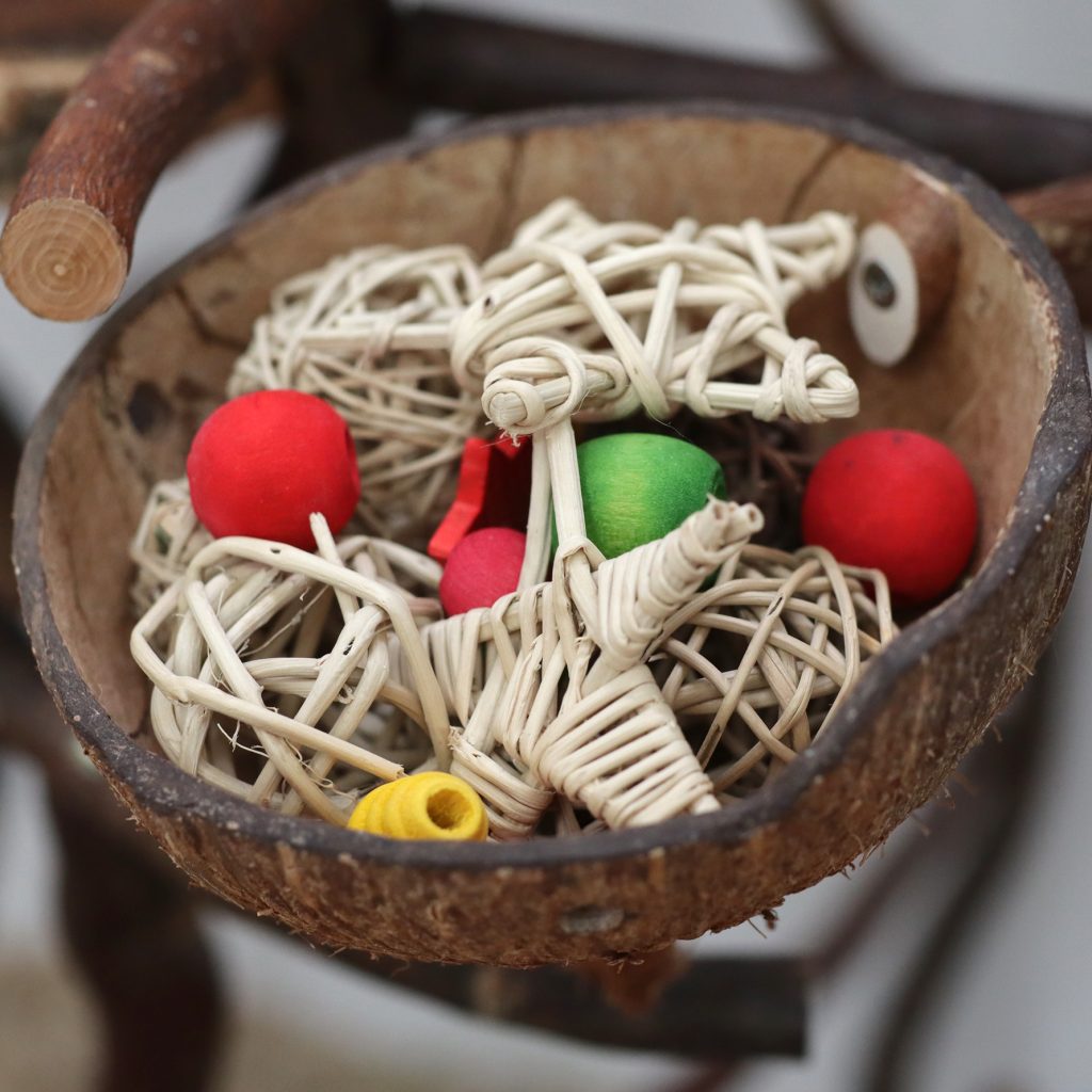 Dafür eignet sich alles, was man auch in einer Wühlkiste finden kann: kleine Holzteile, Stöckchen, Flechtwerke aus Weide, Blüten, Blätter, Zapfen, Nussschälchen u.a., gerne auch mal ein Leckerchen dabei. Der Phantasie sind hier keine Grenzen gesetzt. Die einzige Grenze: es muss vogeltauglich sein und darf weder giftig sein, noch sonstige Gefahrenquellen bergen. Naturmaterialien sind immer das Beste.