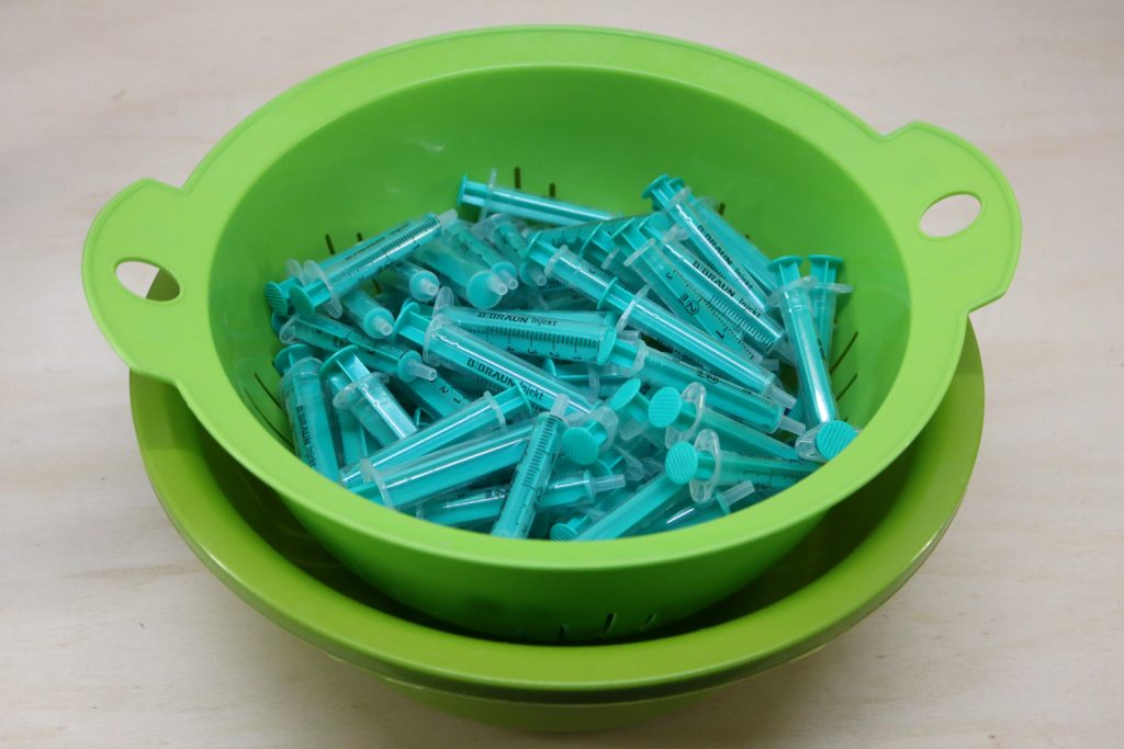 Spritzen spülen gehört nicht zu meinen Lieblingsaufgaben, muss aber aus ökologischen und finanziellen Gründen sein. Wir brauchen jeden Tag 6 x 2 ml für die Verabreichung von Medis der chronisch Kranken und 2 x 5 ml zum Nachspülen für Mimsi und klar: Spritzentraining für alle. Von anderen Medigaben, die im Einzelfall gegeben werden, mal ganz abgesehen…