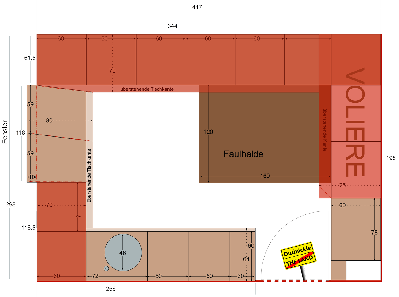 Info zur Darstellung: alle rötlich unterlegten Stellen sind Vogelbereich und ich werde nie das Gefühl haben, dass es genug ist. Wenn ich es könnte, hätten die Vögel mindestens 30 m². Mir selbst reichen die 14 m² zum Wohnen und Schlafen vollkommen aus. Eine kleine Werkstatt wäre natürlich auch ganz nett…